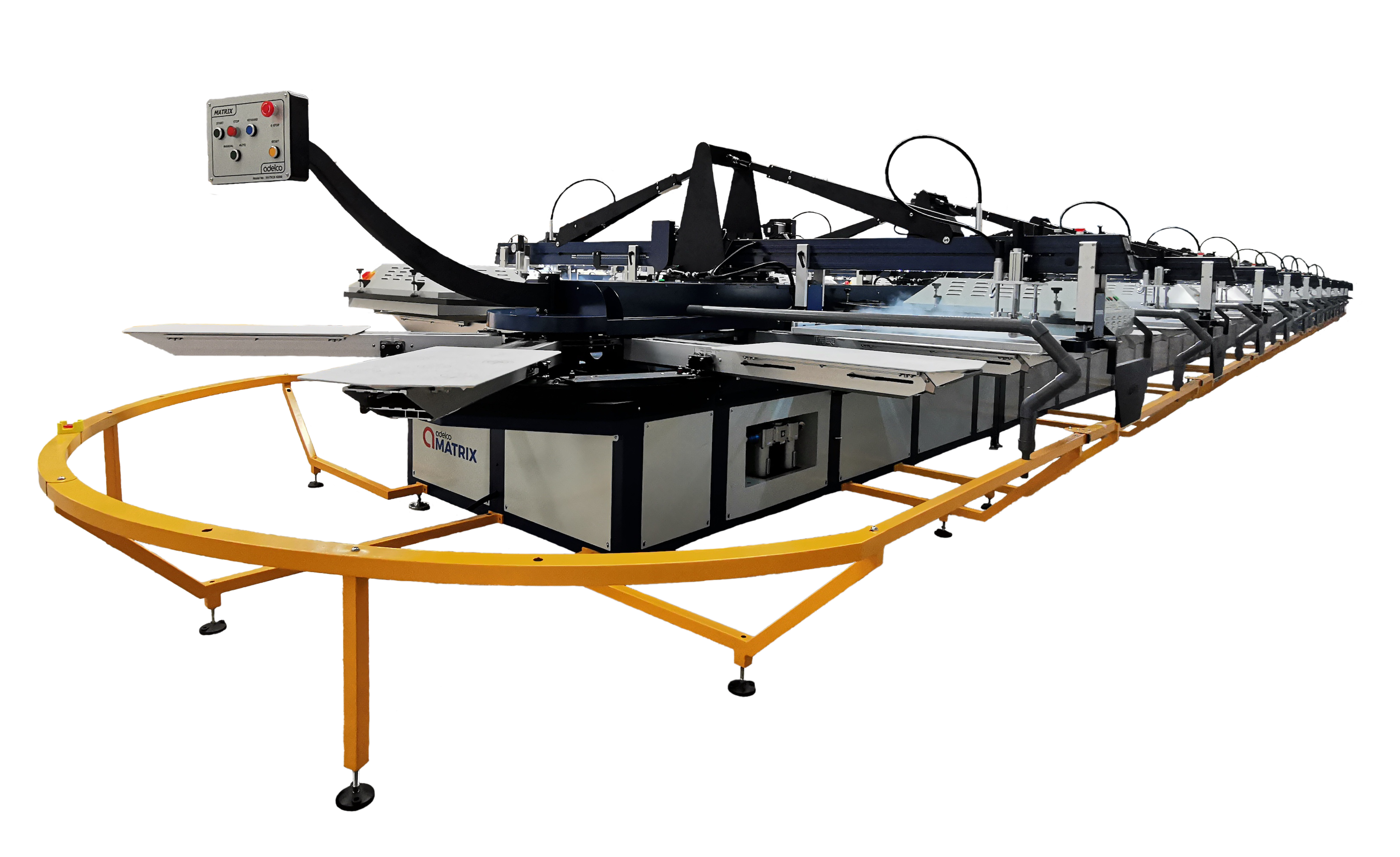 The Matrix Oval screen printing machine from Adelco offers a more efficient use of space thanks to its oval-shaped design. It offers greater stability with larger print press areas than comparable carousel based machines. The Matrix Oval printer provides more versatility with multiple flashes, cooling and specialty print stations, providing the most demanding ecological print solution